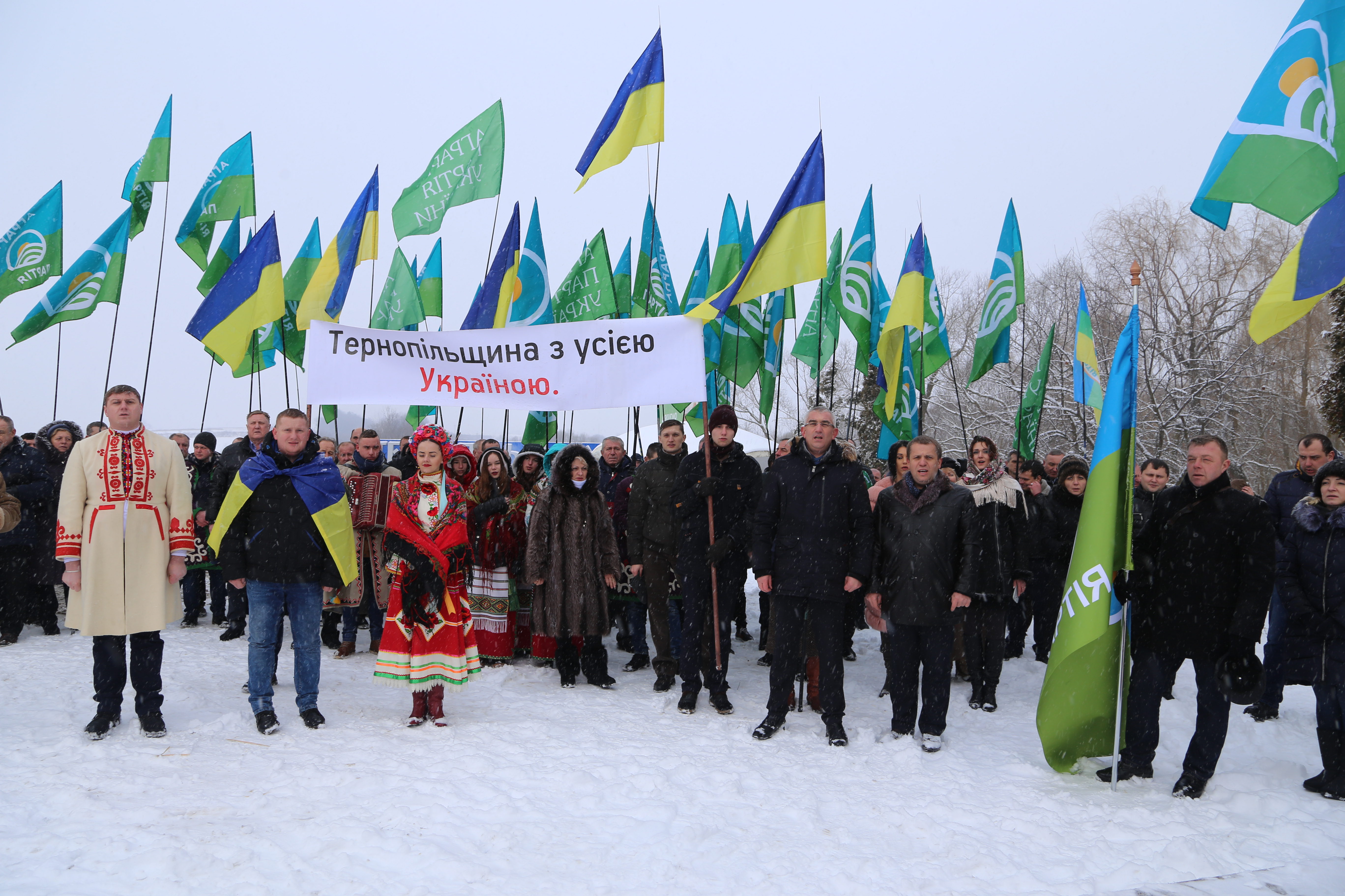 Традиційно 22 січня жителі Тернопільської та Хмельницької областей, як і всі українці, відзначили День Соборності. Сьогоднішнє свято керівництво та актив «Аграрної партії» Тернопільщини та Хмельниччини провели на межі двох областей по річці Збруч, де колись пролягав кордон між Австро-Угорщиною та Російською імперією.